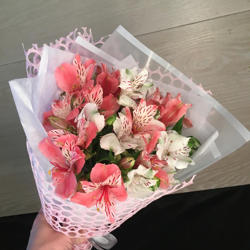 Альстромерия Микс Европа – 9 шт.Упаковка дизайнерская – 1 шт.Лента атласная – 1 шт.Рускус сочи – 3 шт.