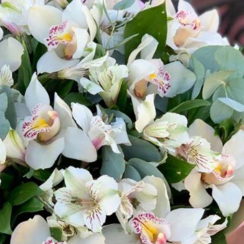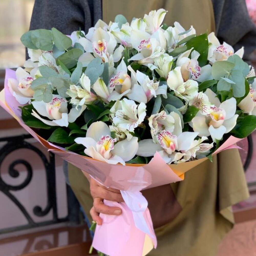 Орхидея Цимбидиум ветка – 1 шт.Альстромерия – 7 шт.Эвкалипт – 5 шт.Зелень – 15 шт.Упаковка дизайнерская – 3 шт.
