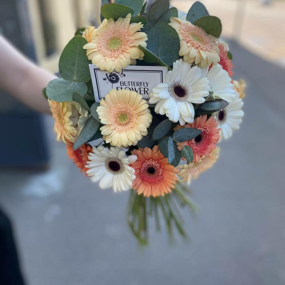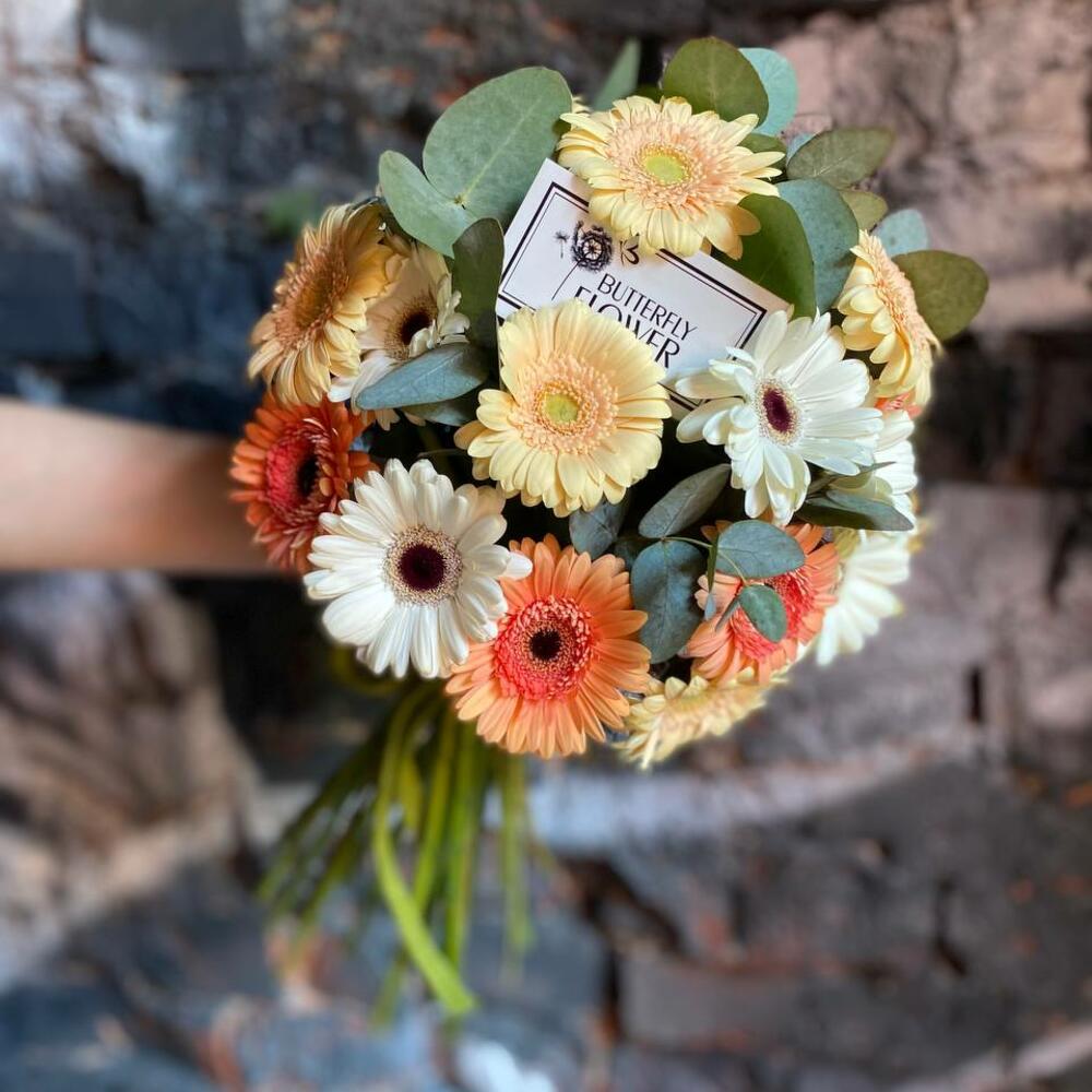 Букет из 25 разноцветных мини-гербер и эвкалипта “Персиковый калейдоскоп”