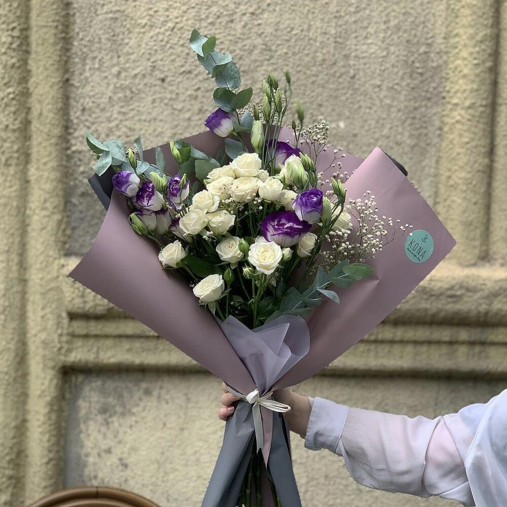 white spray rose – 5 шт. purple eustoma – 5 шт. Gypsophila – 2 шт. Eucalyptus – 3 шт.