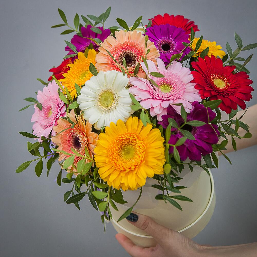 Букет из 15 гербер микс в шляпной коробке