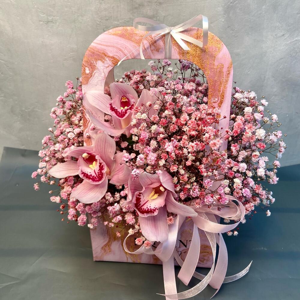 Гипсофила – 6 шт.Орхидея Цимбидиум – 3 шт.Лента атласная – 2 шт.Оазис флористический – 1 шт.Сумка крафт – 1 шт.