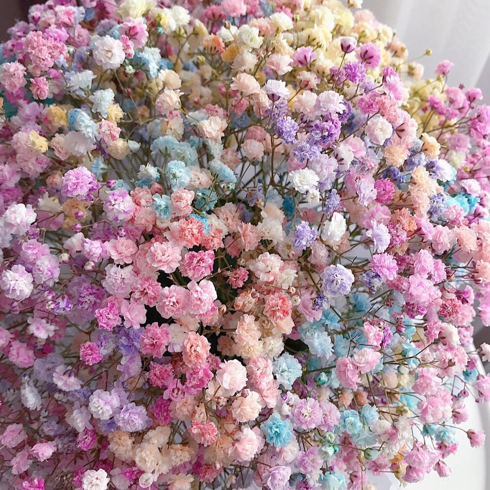 Радужная гипсофила в картонном цилиндре всегда популярна! Ее дарят в качестве подарка для маленькой девочки, на первое свидание, на День рождения жены или мамы! Разноцветные шарики поднимут настроение и украсят любой праздник. После высыхания радужная гипсофила превратится в сухоцветы и будет радовать любимого человека ещё долгое время Как ухаживать за цветами на флористической губке* Следите, чтобы флористическая губка всегда была влажной.* Ежедневно подливайте воду на губку между цветами.* Используйте только прохладную воду. Теплая или слишком холодная вода отрицательно сказывается на состоянии срезанных цветов.* Следите за тем, чтобы букет был вдали от сквозняков, прямых солнечных лучей, а также источников тепла (каминов, батарей). Также нежелательно ставить букет рядом с фруктами и овощами.