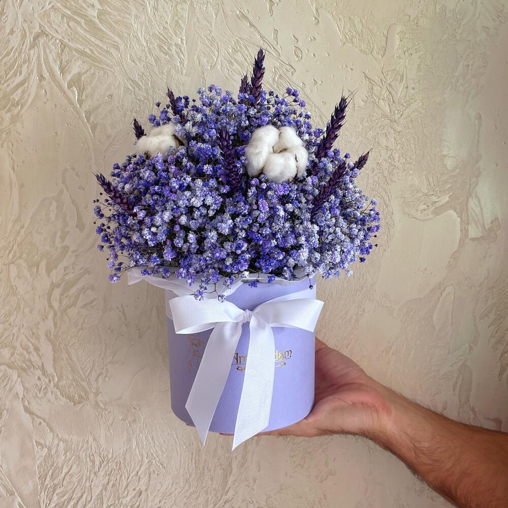 Гипсофила – 7 шт. Хлопок – 3 шт. Коробка шляпная – 1 шт. Пшеница – 11 шт. Оазис флористический – 1 шт.