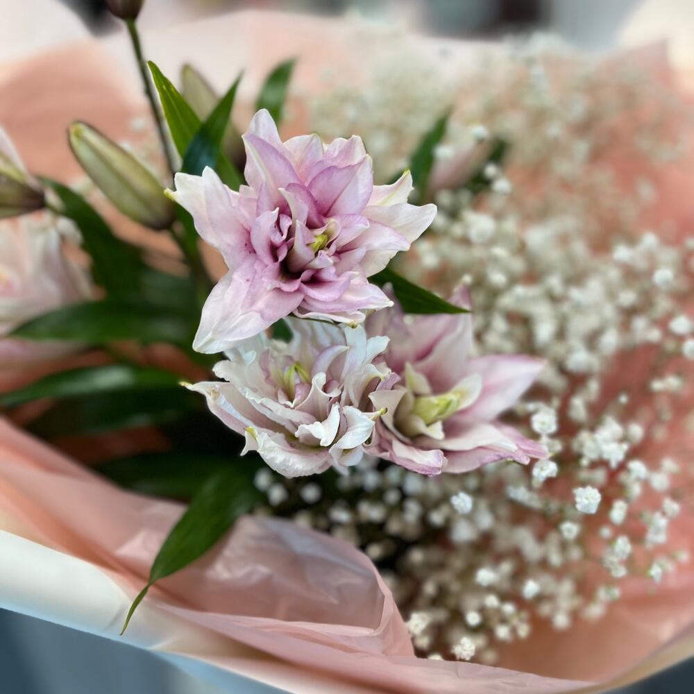 Гипсофила – 5 шт.Лента – 2 шт.Лилия – 1 шт.Упаковка дизайнерская – 3 шт.