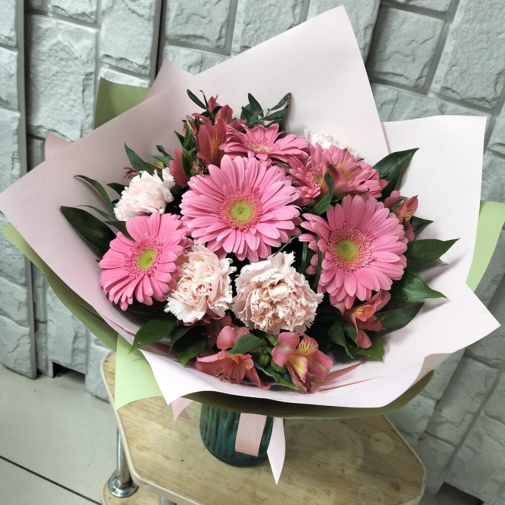 Упаковка – 2 шт.Лента атласная – 1 шт.Гвоздика сортовая – 4 шт.Альстромерия Микс Европа – 3 шт.гербера стандарт – 5 шт.