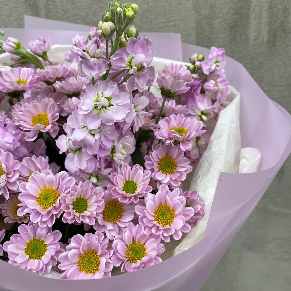 Хризантема кустовая – 5 шт.Маттиола – 6 шт.Упаковка дизайнерская – 1 шт.