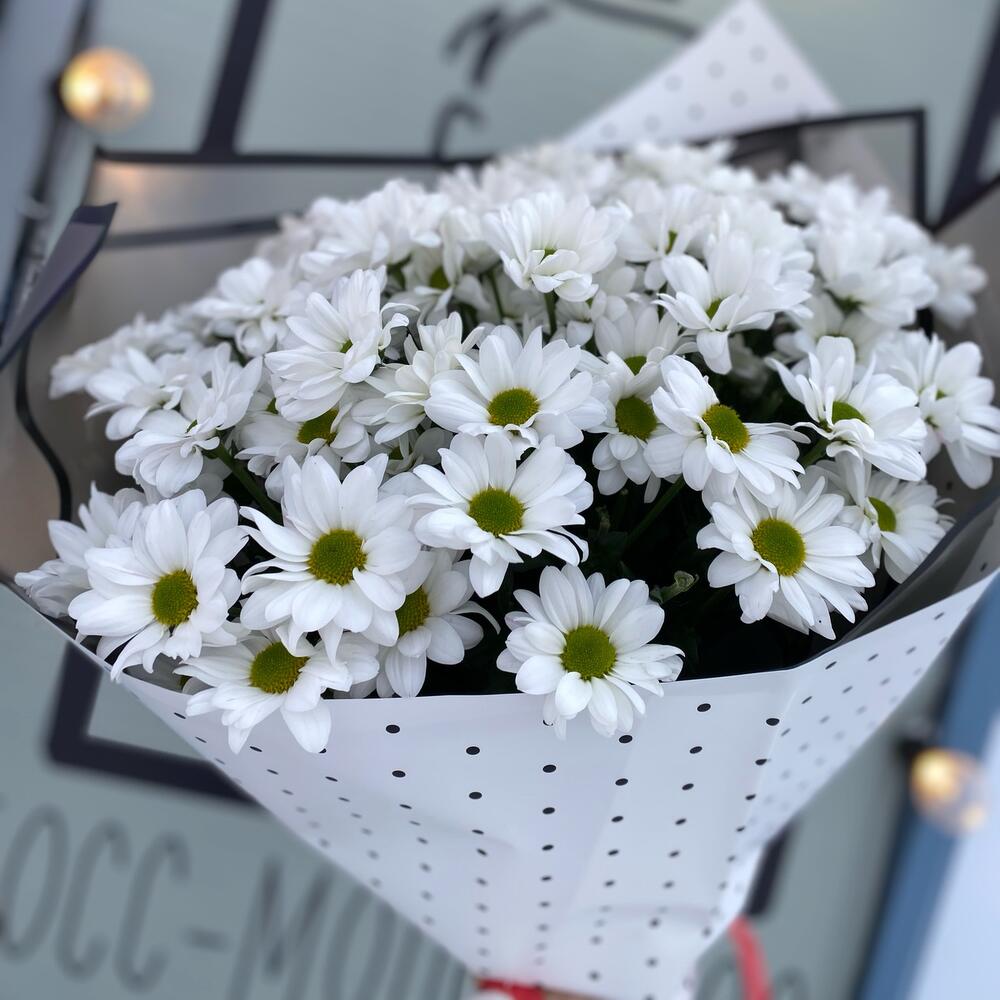 Хризантема кустовая – 9 шт.Упаковка дизайнерская – 2 шт.Лента – 1 шт.