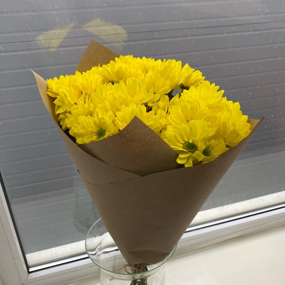 Хризантема кустовая желтая ромашковидная – 5 шт.Крафт упаковка – 1 шт.веревка декоративная – 1 шт.