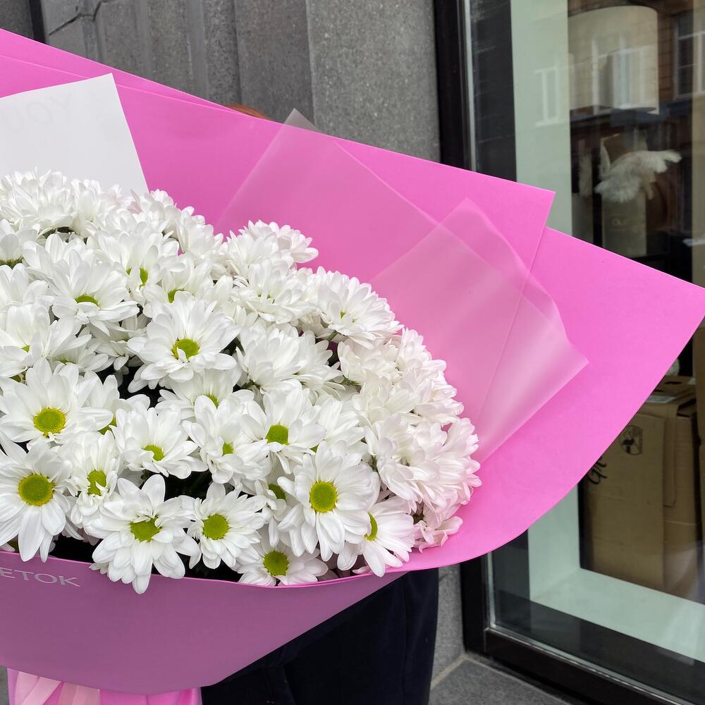 Хризантема кустовая – 13 шт.Фоамиран – 4 шт.Пленка дизайнерская – 2 шт.Лента атласная – 2 шт.