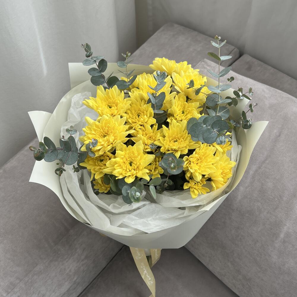 Хризантема кустовая – 3 шт.Упаковка – 1 шт.эвкалипт цинерея пучок – 1 шт.тишью белая хрустящая – 1 шт.