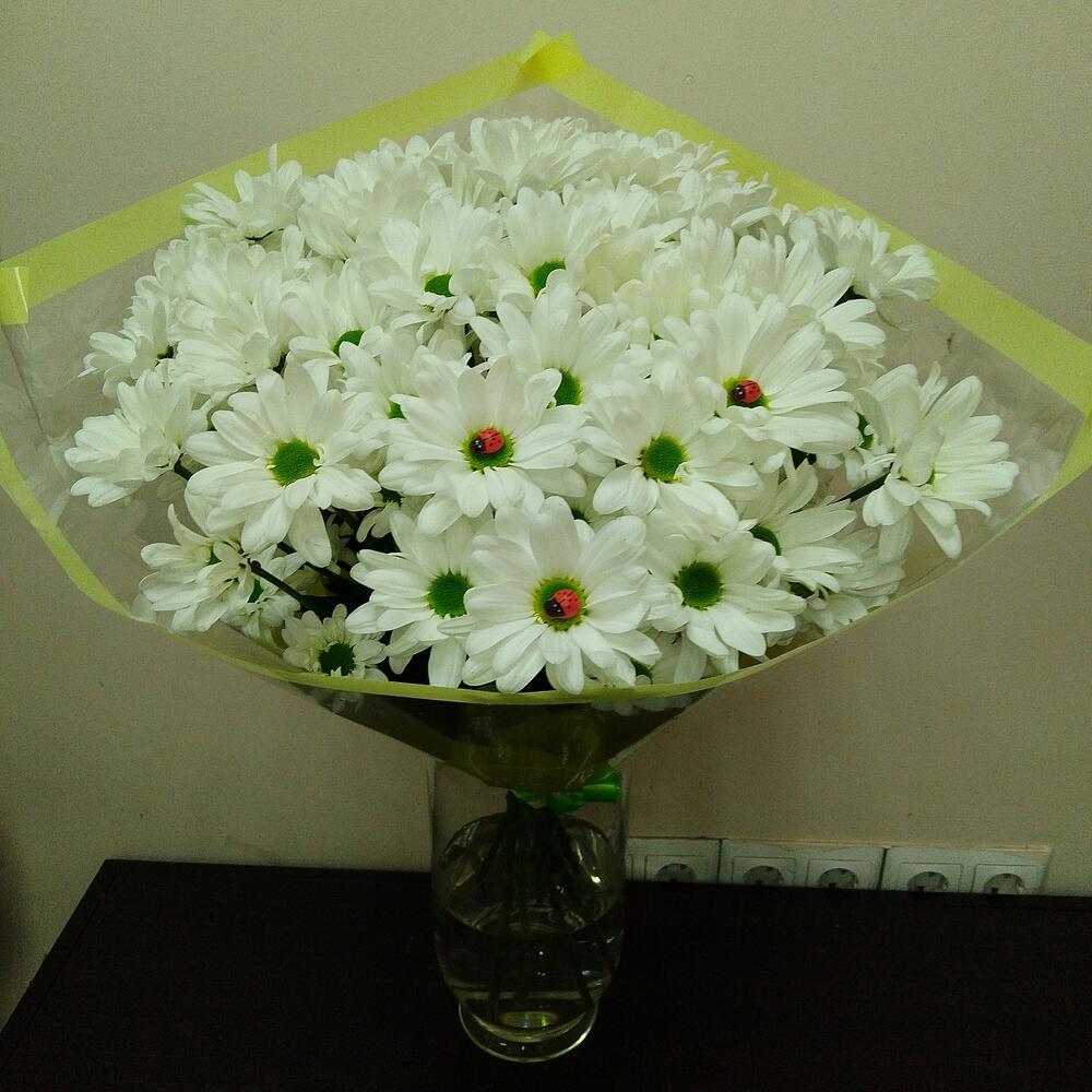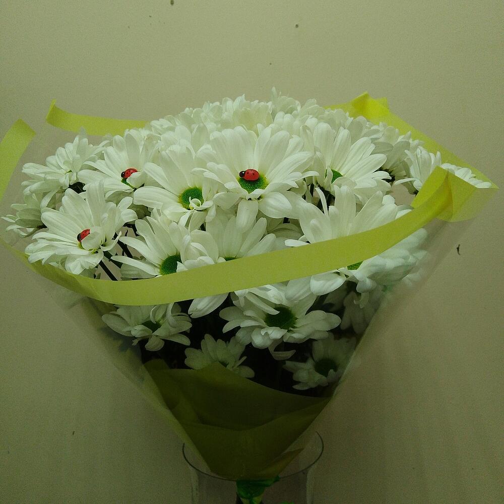 Лента – 1 шт.Хризантема кустовая белая – 9 шт.Упаковка дизайнерская – 1 шт.декоративные элементы – 3 шт.