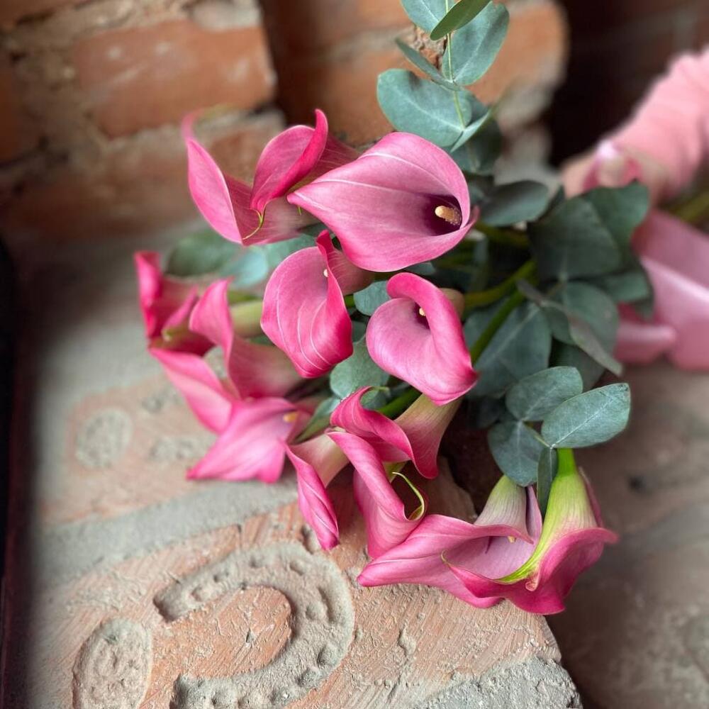 Букет из 15 розовых калл с эвкалиптом “Морион”