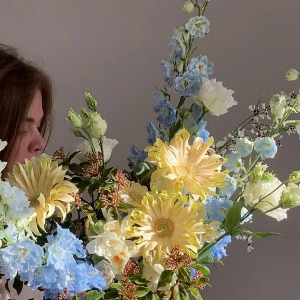 Букет с нарциссами, дельфиниумом и кудрявой герберой