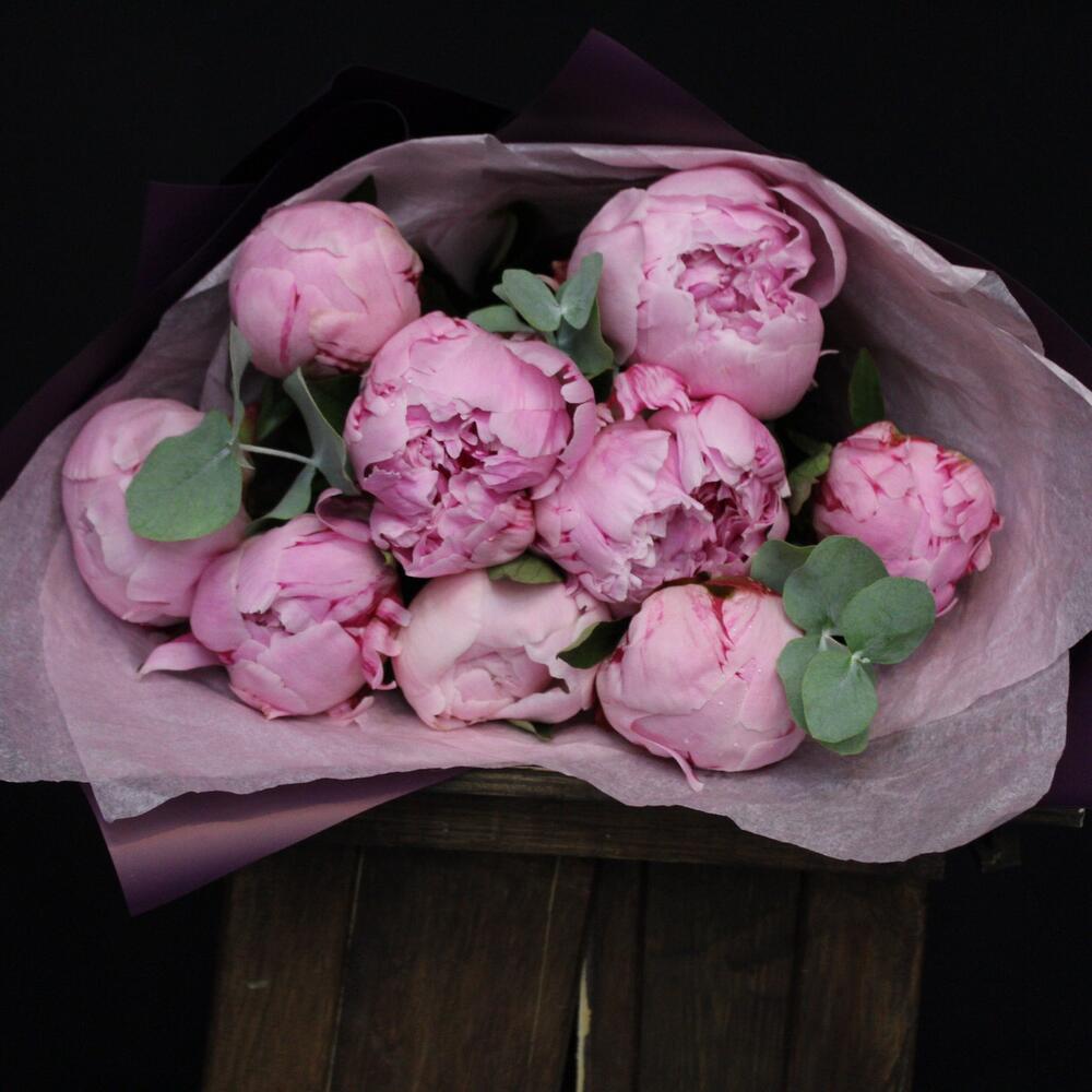 9 пионов с эвкалиптом