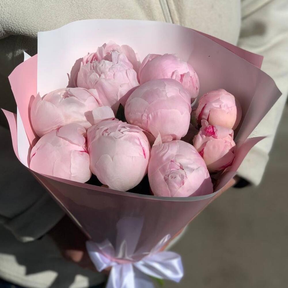 Пион розовый – 9 шт.Упаковка дизайнерская – 1 шт.Лента атласная – 1 шт.