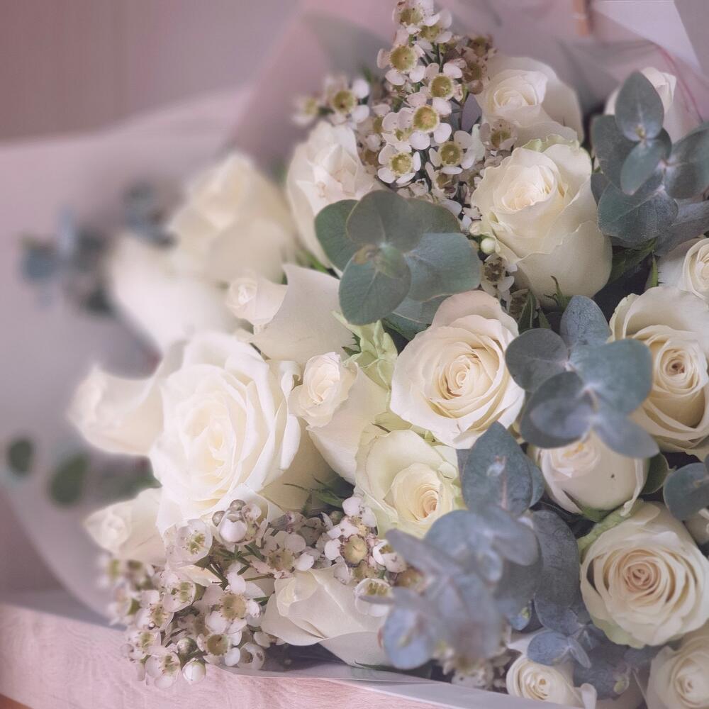 Лента атласная – 1 шт.Открыточка с вашими пожеланиями – 1 шт.Роза кенийская 50 см – 25 шт.Хамелациум белый – 2 шт.Эвкалипт Baby Blue – 5 шт.упаковка дизайнерская бумага – 2 шт.