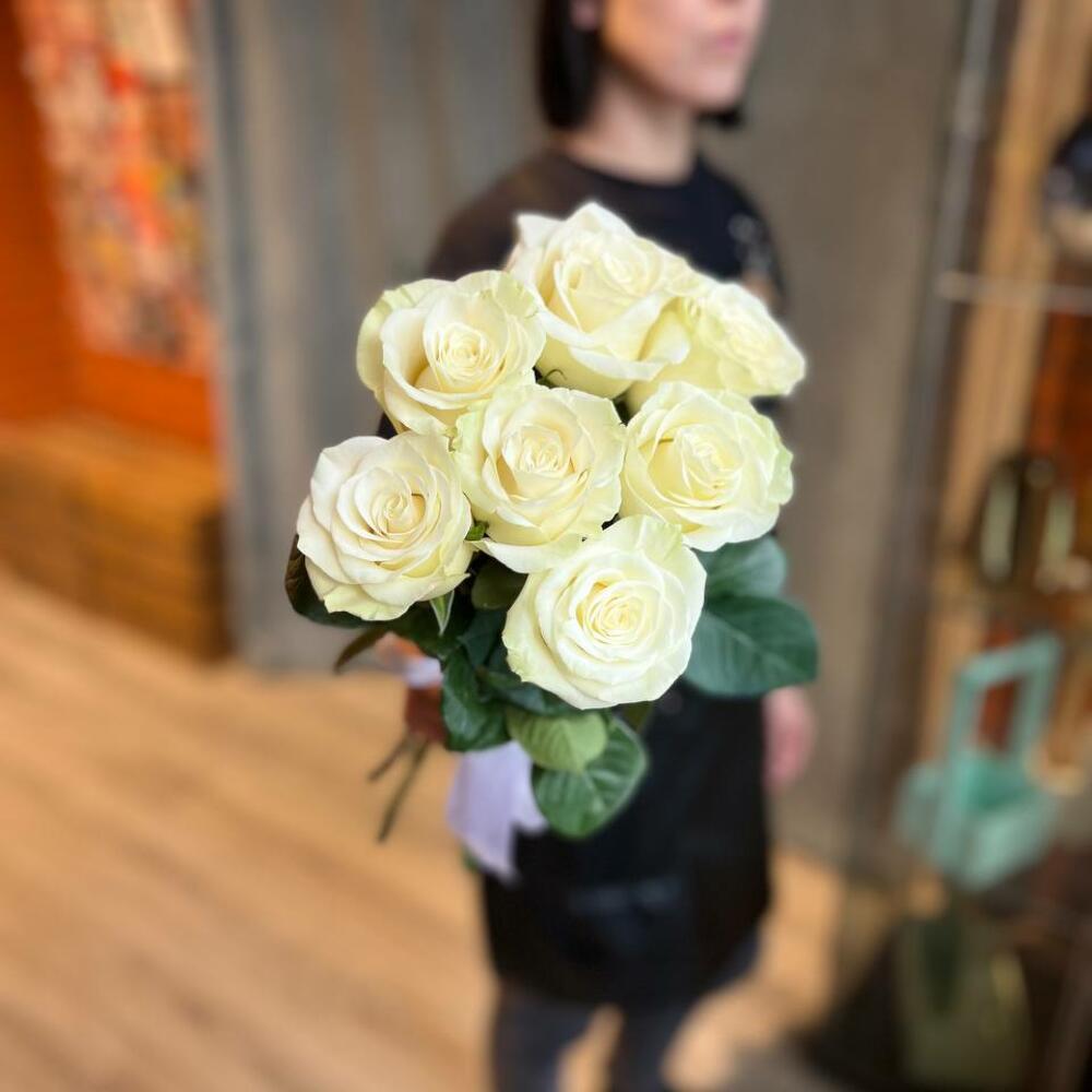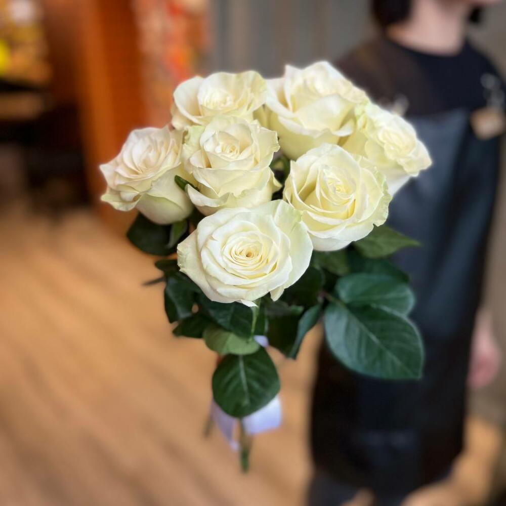 белые розы эквадор 50 см – 7 шт.Лента атласная – 2 шт.