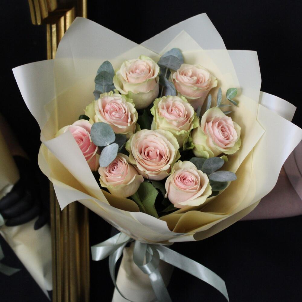 роза фруттето эквадор – 9 шт.Эвкалипт – 3 шт.Пленка матовая – 4 шт.Лента атласная – 2 шт.