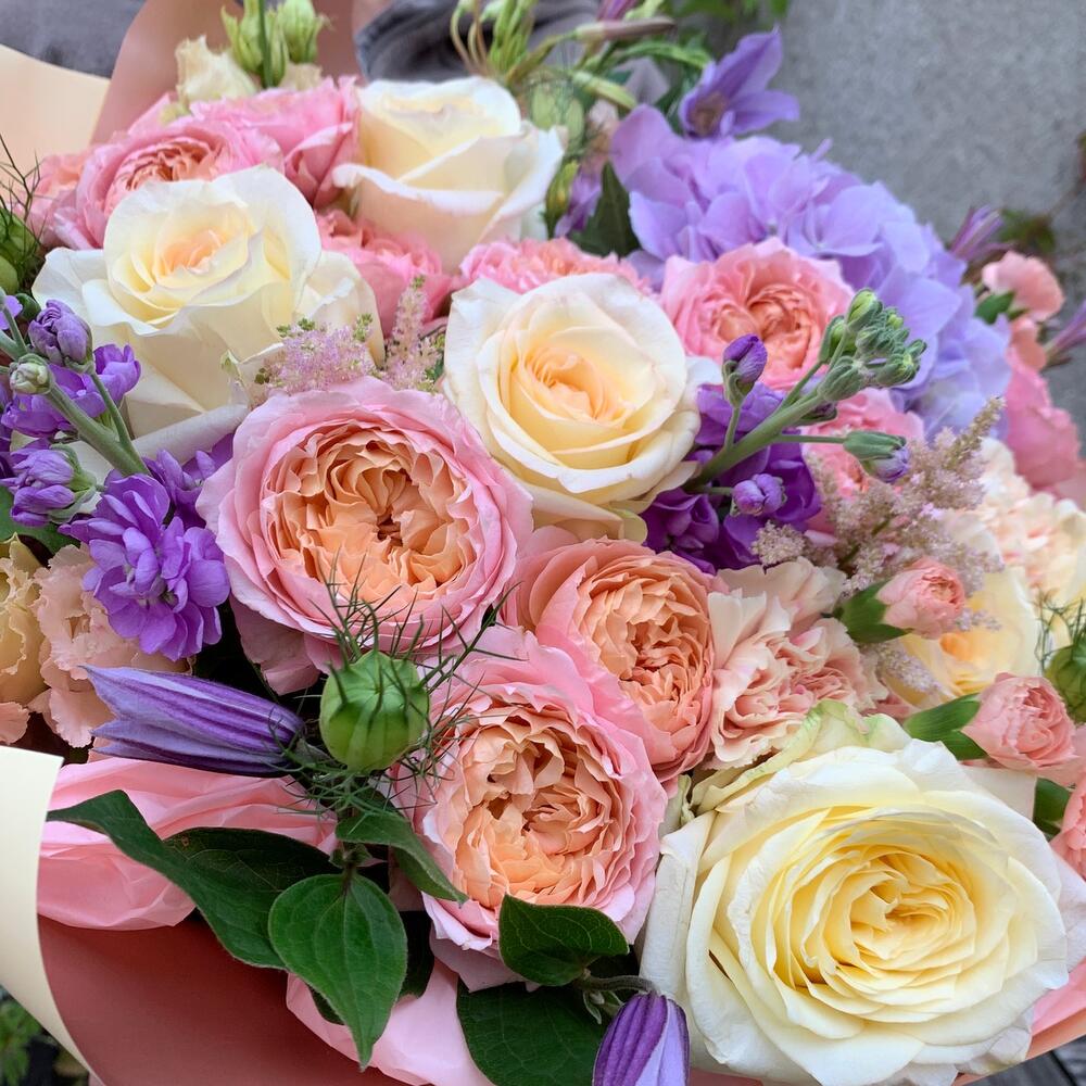 Астильба – 2 шт.Маттиола – 3 шт.Бант – 1 шт.Роза пионовидная – 8 шт.Клематис – 3 шт.Упаковка дизайнерская – 2 шт.Нигелла – 2 шт.Диантус сортовой – 7 шт.Роза кустовая пионовидная джульетта – 5 шт.зелень декоративная – 5 шт.гортензия лавандовая – 1 шт.лизиантус алиса шампань – 3 шт.трителлия – 3 шт.