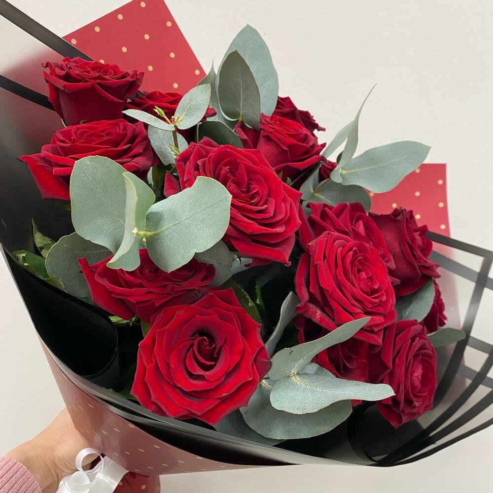 Букет из 15 роз с эвкалиптом