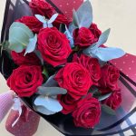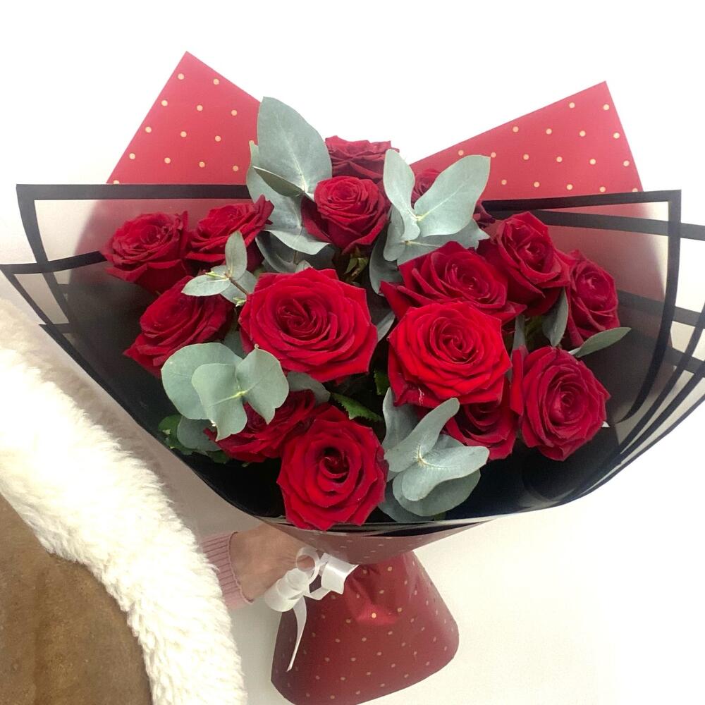 роза ред наоми. – 15 шт.Эвкалипт – 2 шт.Упаковка дизайнерская – 2 шт.Лента – 1 шт.