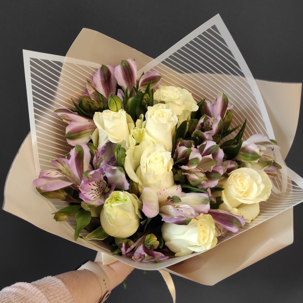 Букет из белых роз с фиолетовой альстромерией S