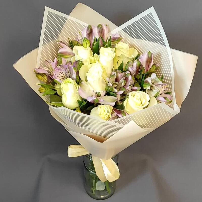 Роза – 7 шт.Альстромерия – 5 шт.Пленка матовая – 2 шт.Лента атласная – 1 шт.