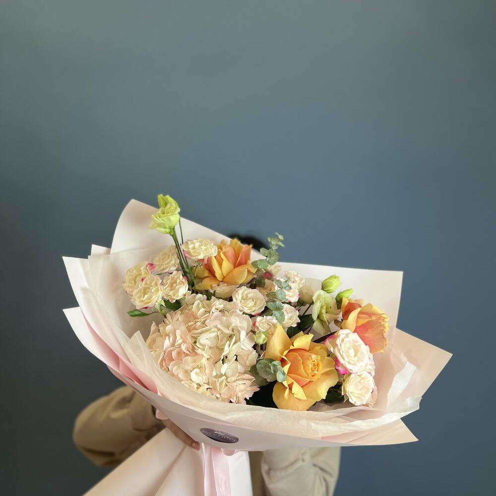 Альстромерии, Гвоздики, Кустовые розы, Лизиантусы, Розы, Хризантемы