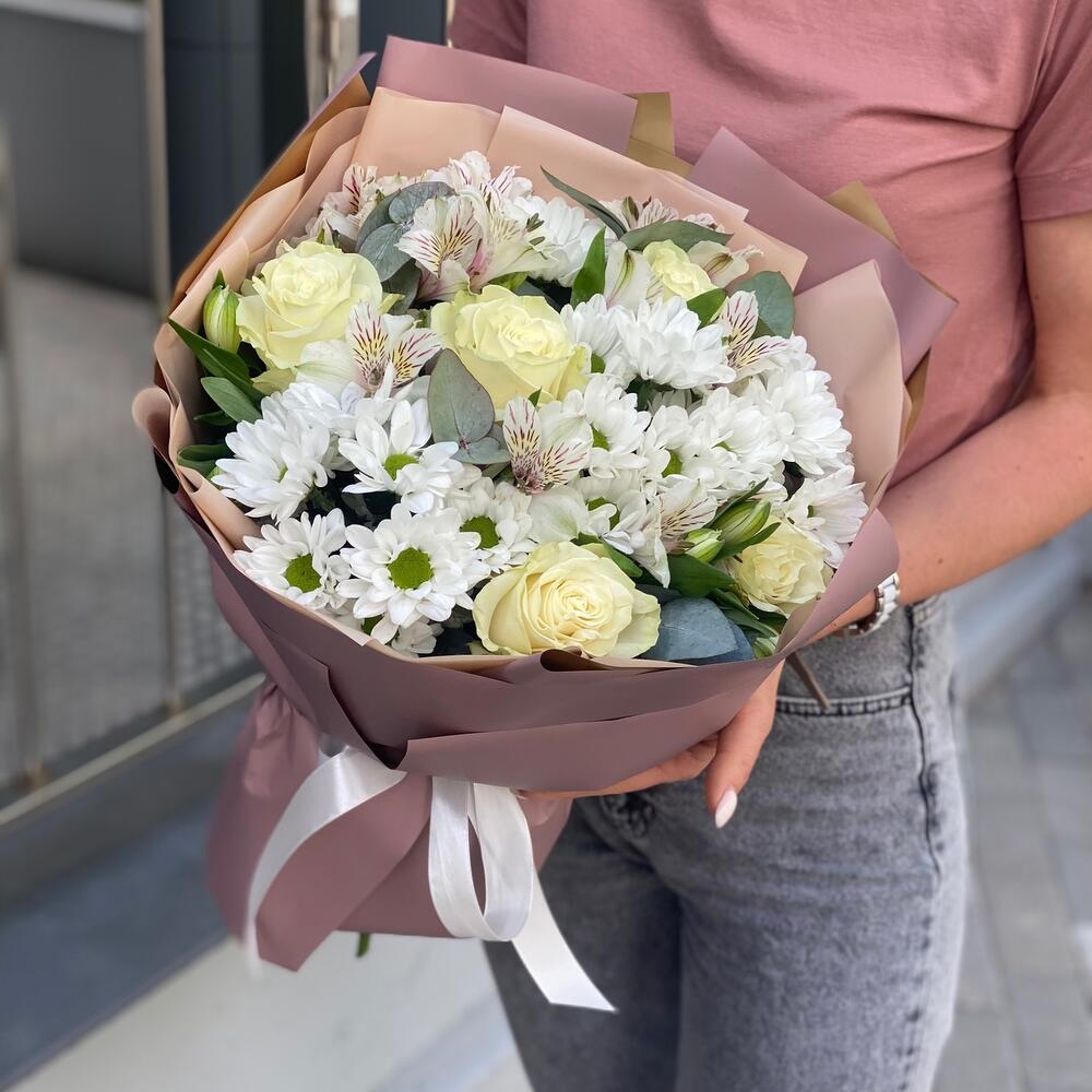 Эвкалипт – 2 шт. Хризантема – 4 шт. Роза белая мондиаль – 5 шт. Альстромерия – 6 шт. Оформление – 1 шт.