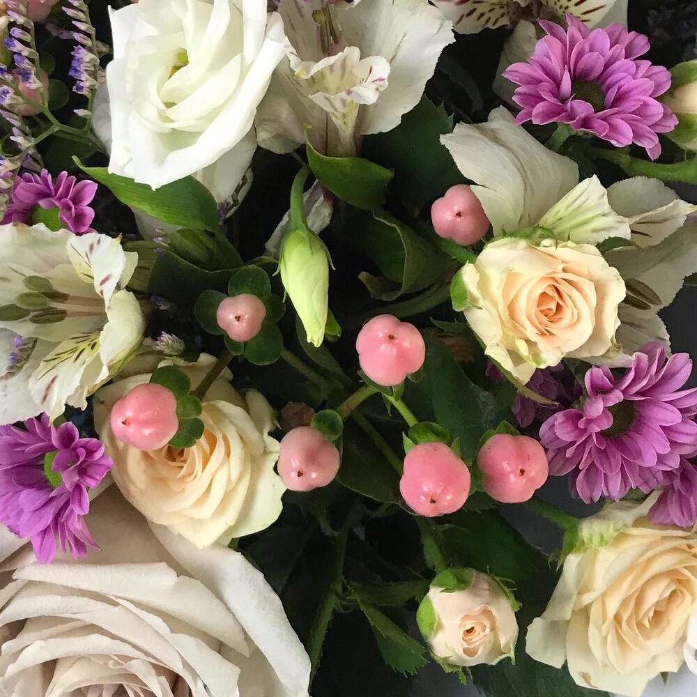 Лизиантус – 3 шт.Лимониум – 2 шт.Роза кустовая – 3 шт.Хризантема кустовая – 4 шт.Роза – 3 шт.Хиперикум – 3 шт.Упаковка дизайнерская – 2 шт.