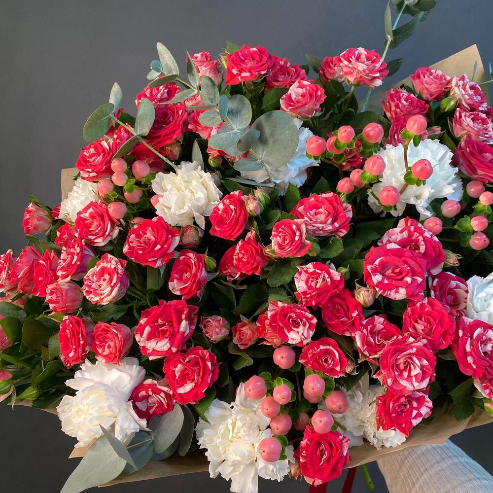 Роза кустовая – 9 шт.Лента атласная – 1 шт.Диантус – 7 шт.Крафт упаковка – 5 шт.Гиперикум розовый – 4 шт.эвкалипт ветка – 2 шт.