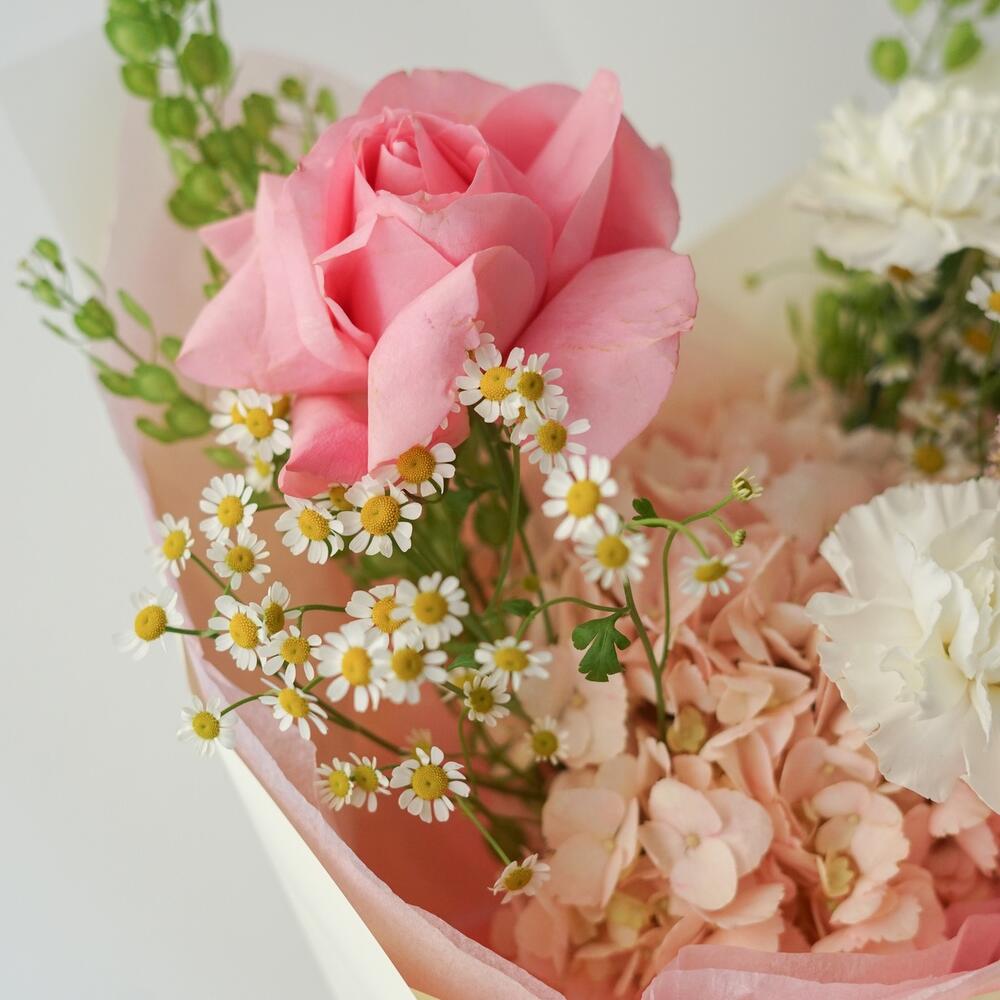 Букет с гортензией, розой, матрикарией