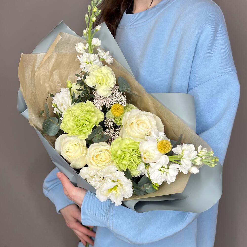 Букет в бело-зелёных оттенках с матиолой и белой розой