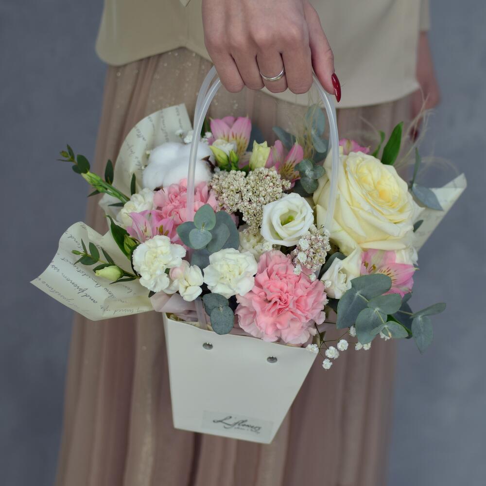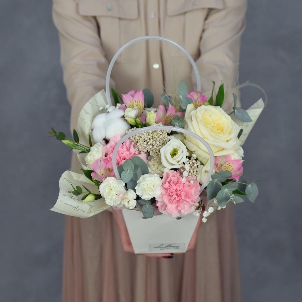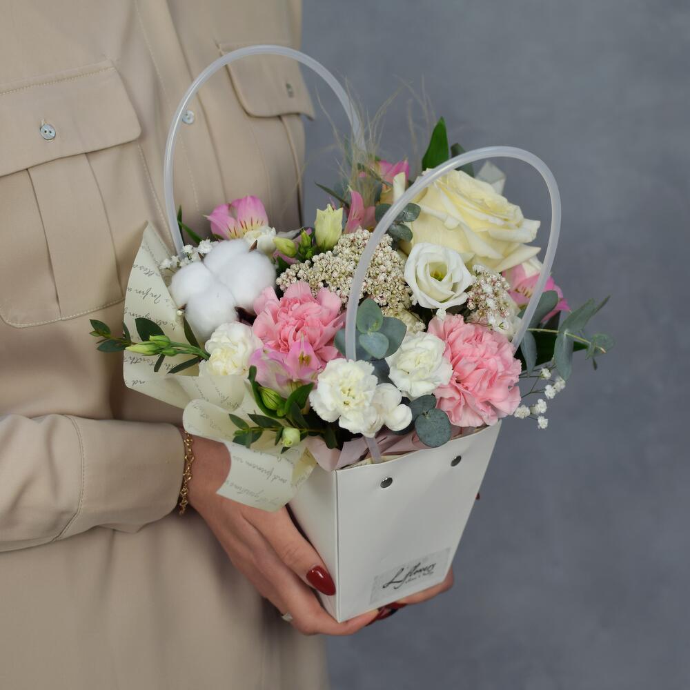 Роза пионовидная – 1 шт.Хлопок – 1 шт.Диантус – 2 шт.Диантус кустовой – 1 шт.Лизиантус – 1 шт.Озотамнус – 1 шт.Альстромерия – 1 шт.пеннисетум – 1 шт.Гипсофила – 1 шт.Фисташка – 2 шт.Оазис – 1 шт.Сумка – 1 шт.