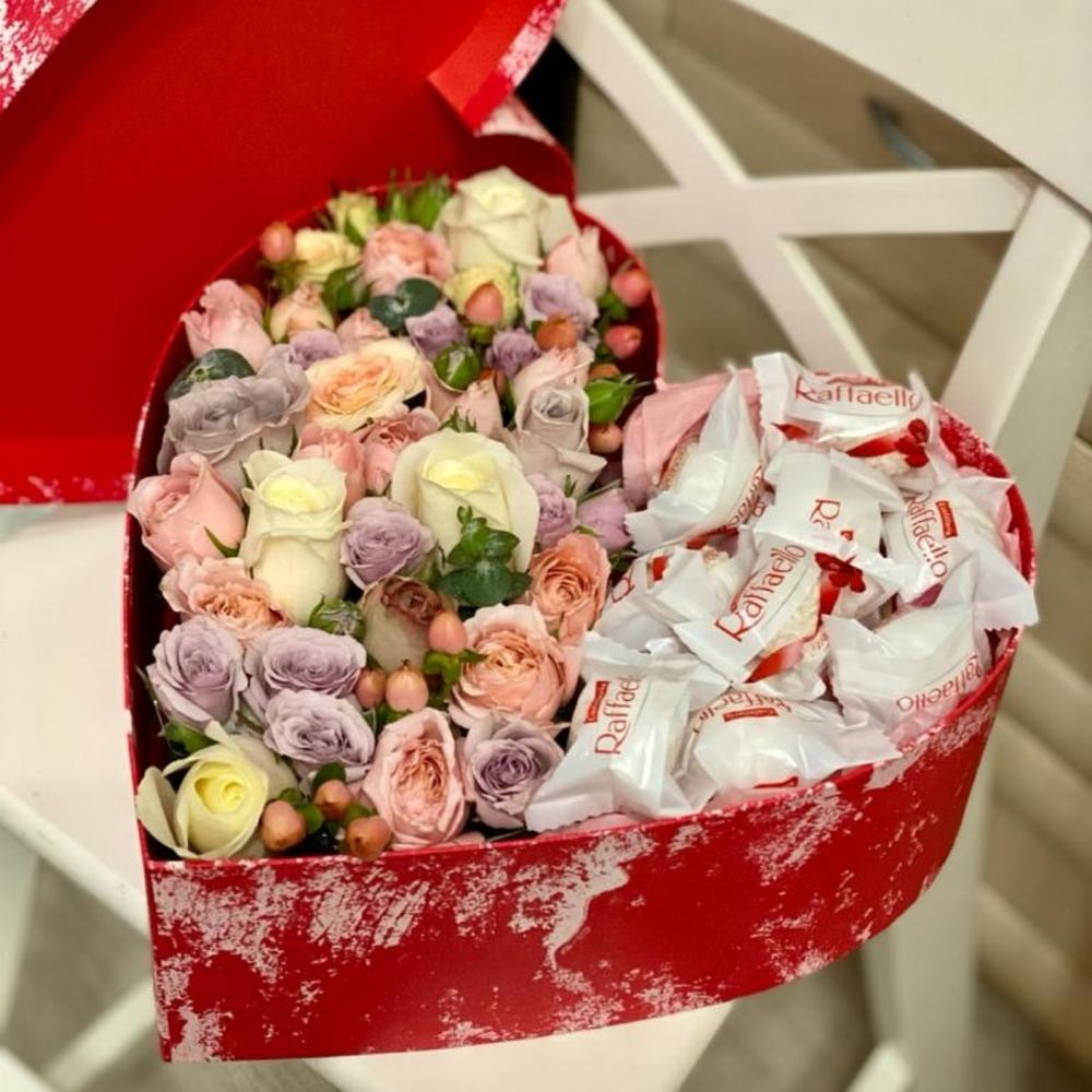 Коробка в виде сердца с миксом из роз и конфетами рафаэлло