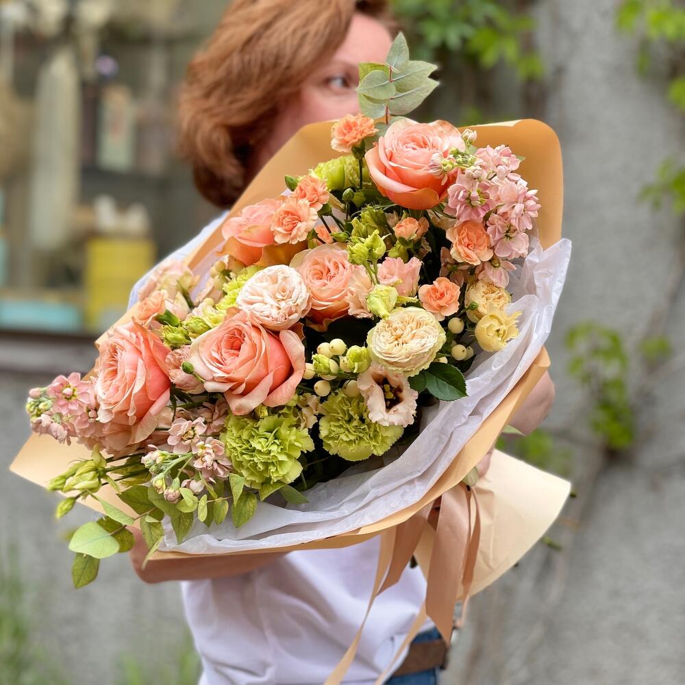 Гвоздики, Лизиантусы, Розы, Тюльпаны