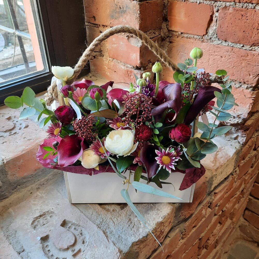 Ящик деревянный – 1 шт.Оазис флористический – 1 шт.Калла – 11 шт.Пион – 1 шт.Гиацинт – 1 шт.Гвоздика – 1 шт.Роза пионовидная кустовая – 1 шт.Скиммия – 1 шт.Антуриум – 1 шт.Эвкалипт – 1 шт.