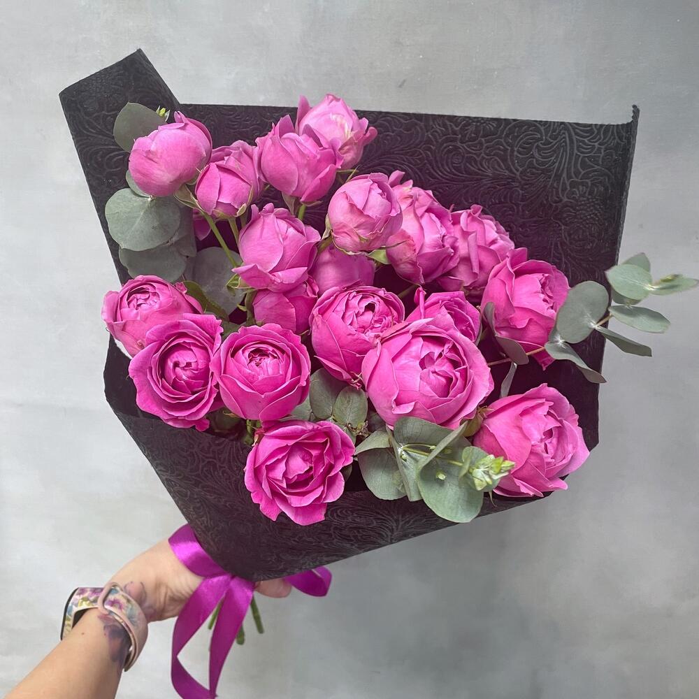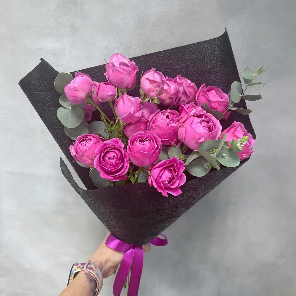 Роза кустовая пионовидная – 5 шт.Эвкалипт ценарея – 3 шт.Упаковка дизайнерская – 1 шт.