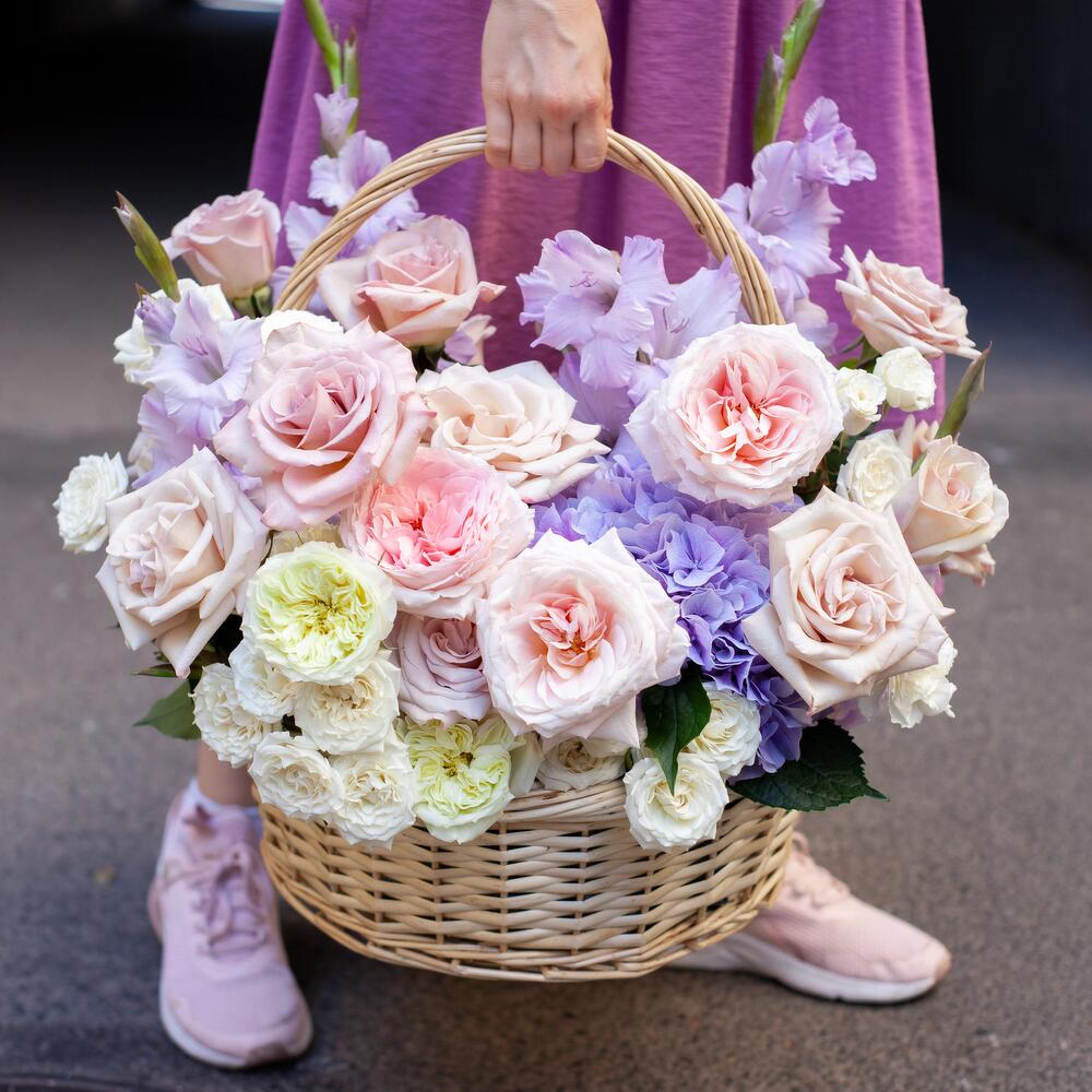 Роза пионовидная – 6 шт.Роза – 8 шт.Диантус – 9 шт.Гортензия – 1 шт.Гладиолус – 4 шт.Роза кустовая – 4 шт.Лизиантус – 3 шт.зелень микс – 3 шт.цветы микс – 4 шт.Корзина – 1 шт.