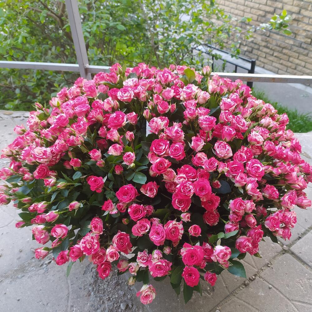 Роза кустовая – 101 шт.Корзина плетеная – 1 шт.Оазис флористический – 3 шт.