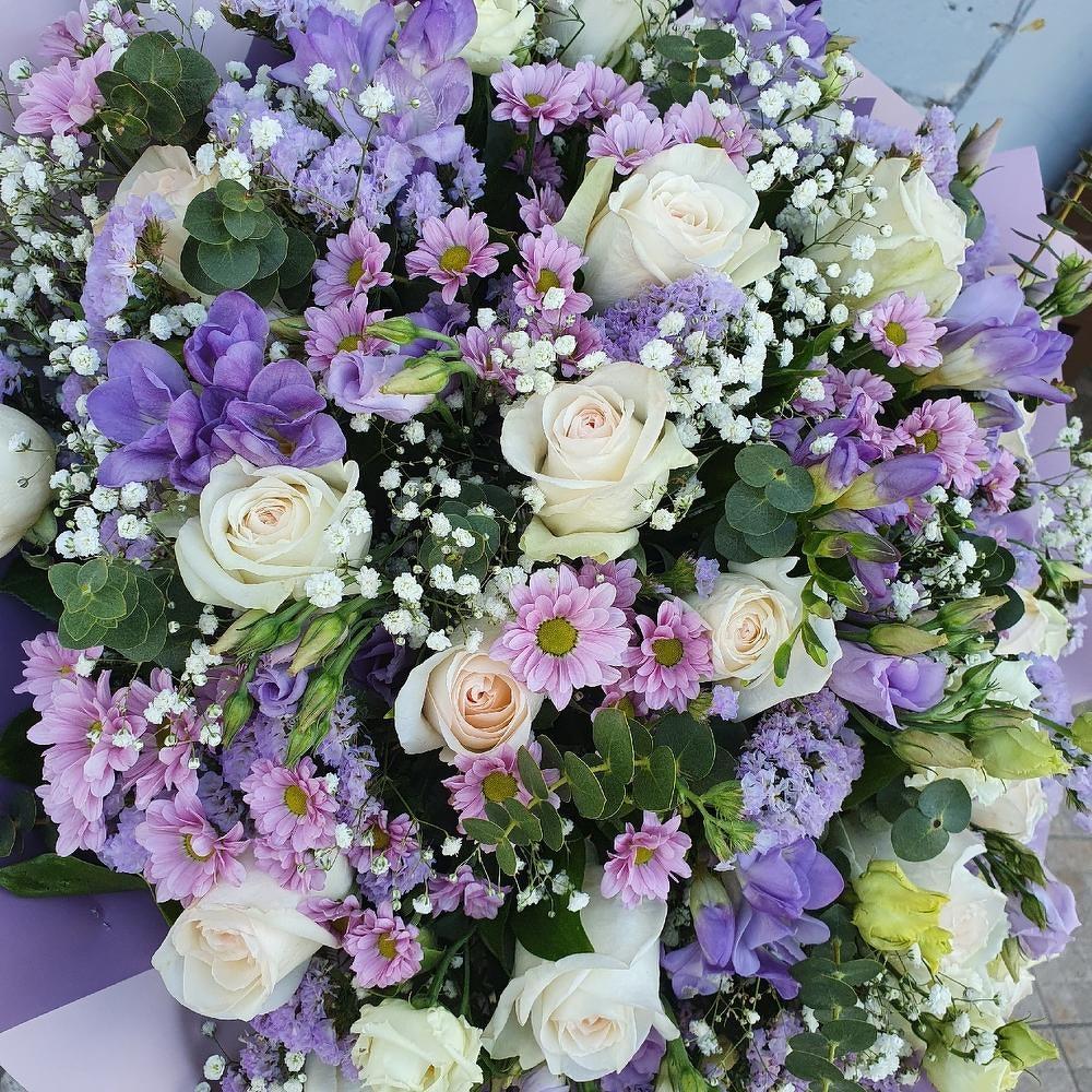 Гипсофила – 5 шт.Эвкалипт – 5 шт.Зелень – 25 шт.Упаковка дизайнерская – 5 шт.Роза Охара – 25 шт.Сантини розовая – 6 шт.Статица лиловая – 5 шт.Фрезия лиловая – 6 шт.
