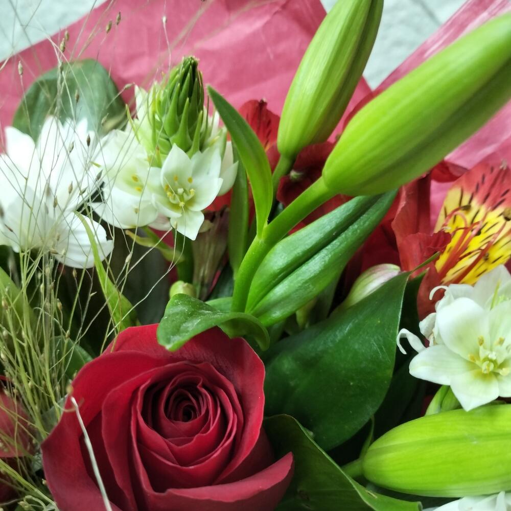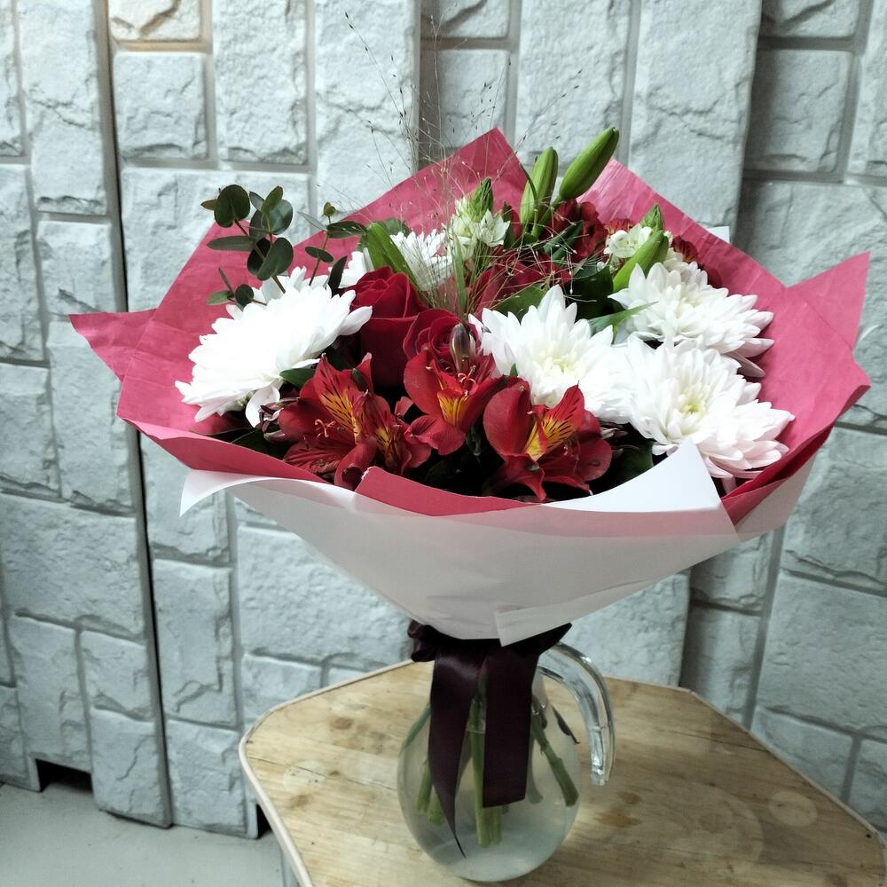 Хризантема кустовая – 2 шт.Роза – 3 шт.Альстромерия Микс Европа – 2 шт.зелень декоративная – 5 шт.Лилия белая – 1 шт.Орнитогалум белый – 2 шт.Паникум Фонтан – 1 шт.Упаковка крафт – 2 шт.Лента атласная – 1 шт.