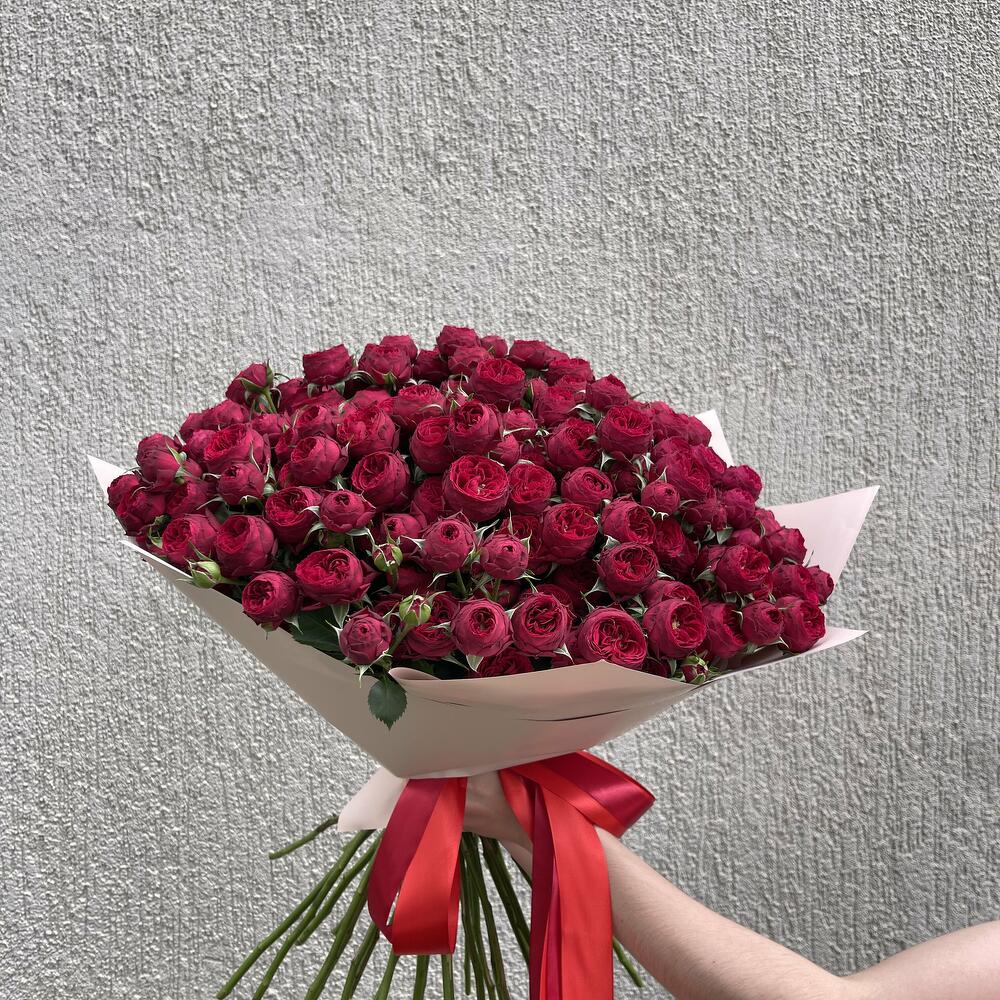 Роза кустовая – 29 шт. Упаковка – 1 шт. Атласная лента – 1 шт.