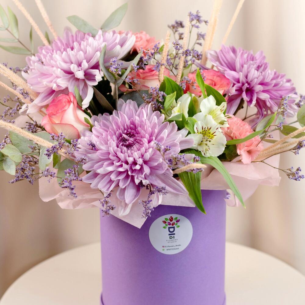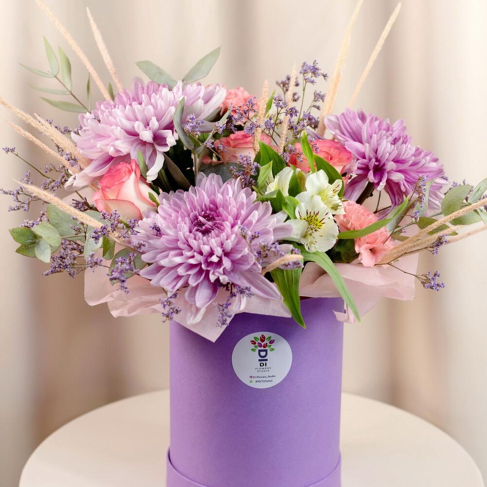 Хризантема – 3 шт. Роза – 3 шт. Альстромерия – 3 шт. Гвоздика – 3 шт. Лимониум – 1 шт. Флум – 1 шт. Эвкалипт – 1 шт.