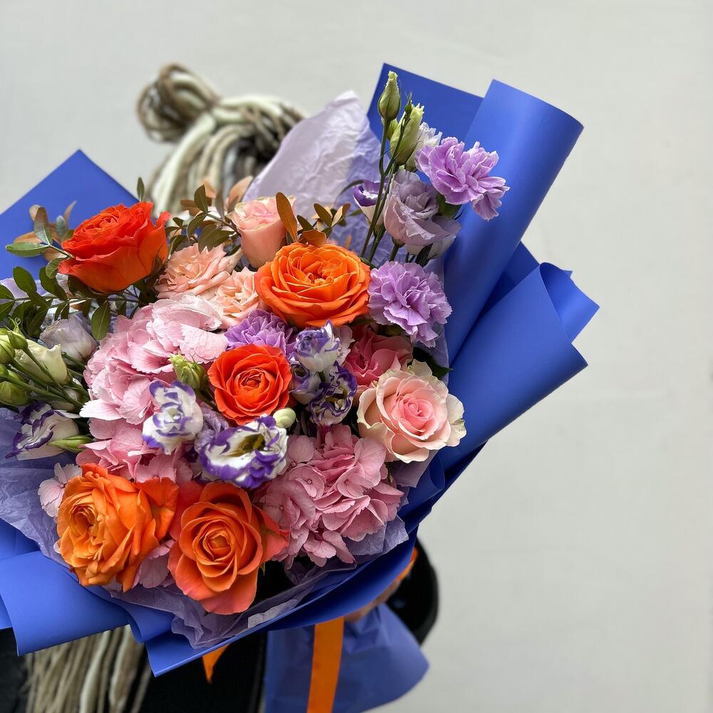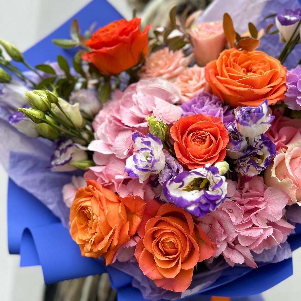 Альстромерии, Гвоздики, Кустовые розы, Лизиантусы, Розы, Хризантемы