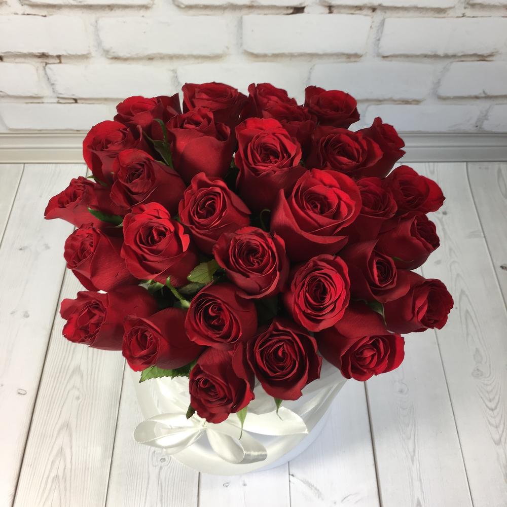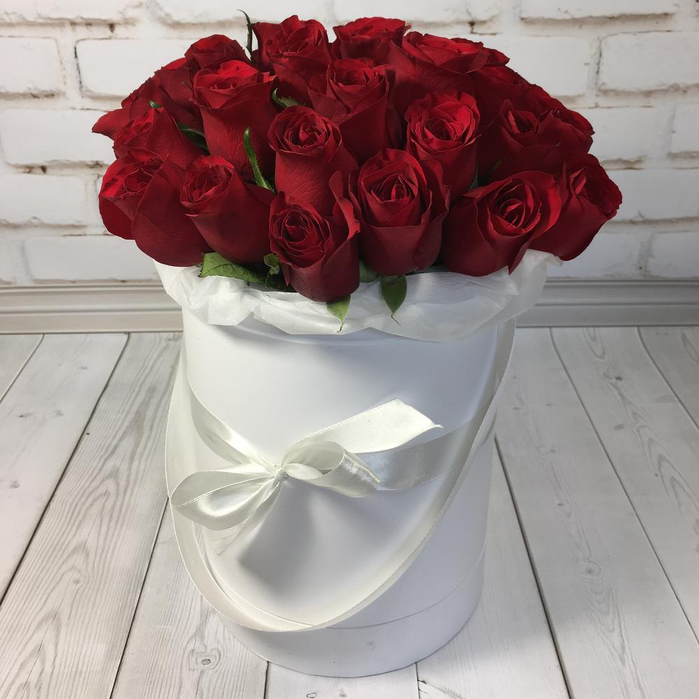 Роза Эквадор – 27 шт.Шляпная коробка – 1 шт.Пиафлор (оазис) – 3 шт.
