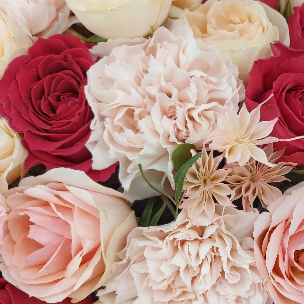 Стильный, фактурный букет из роз и диантусов. Такой букет всегда уместен и подойдёт для любого повода: День Рождения, именины, годовщина свадьбы, рождение ребенка, 8 марта, День Святого Валентина, выпускной и т.д. Можно вручить маме, сестре, подруге, коллеге, учителю, любимой.