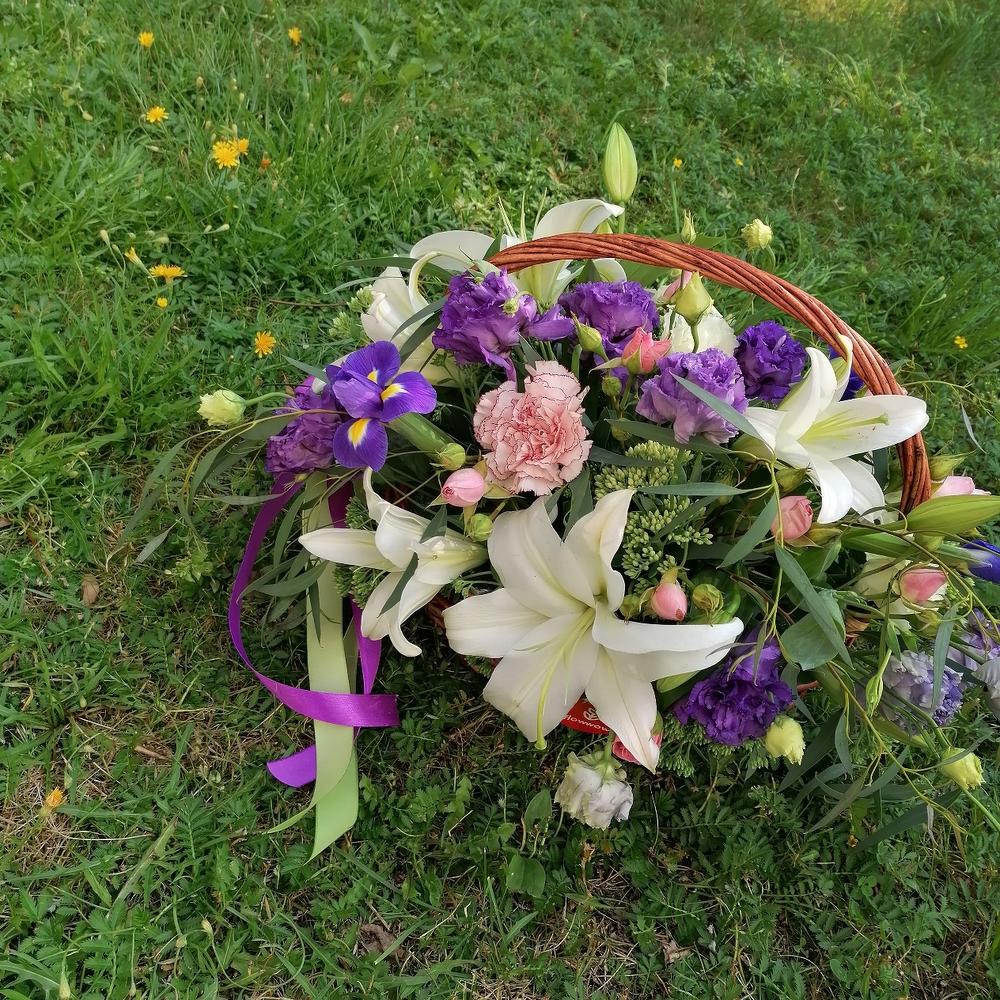 Корзина – 1 шт.Оазис флористический – 1 шт.Эустома – 3 шт.Гвоздика – 2 шт.Лилия – 2 шт.Очиток – 5 шт.Эвкалипт – 5 шт.Ирис – 3 шт.Роза кустовая – 2 шт.Лента атласная – 2 шт.