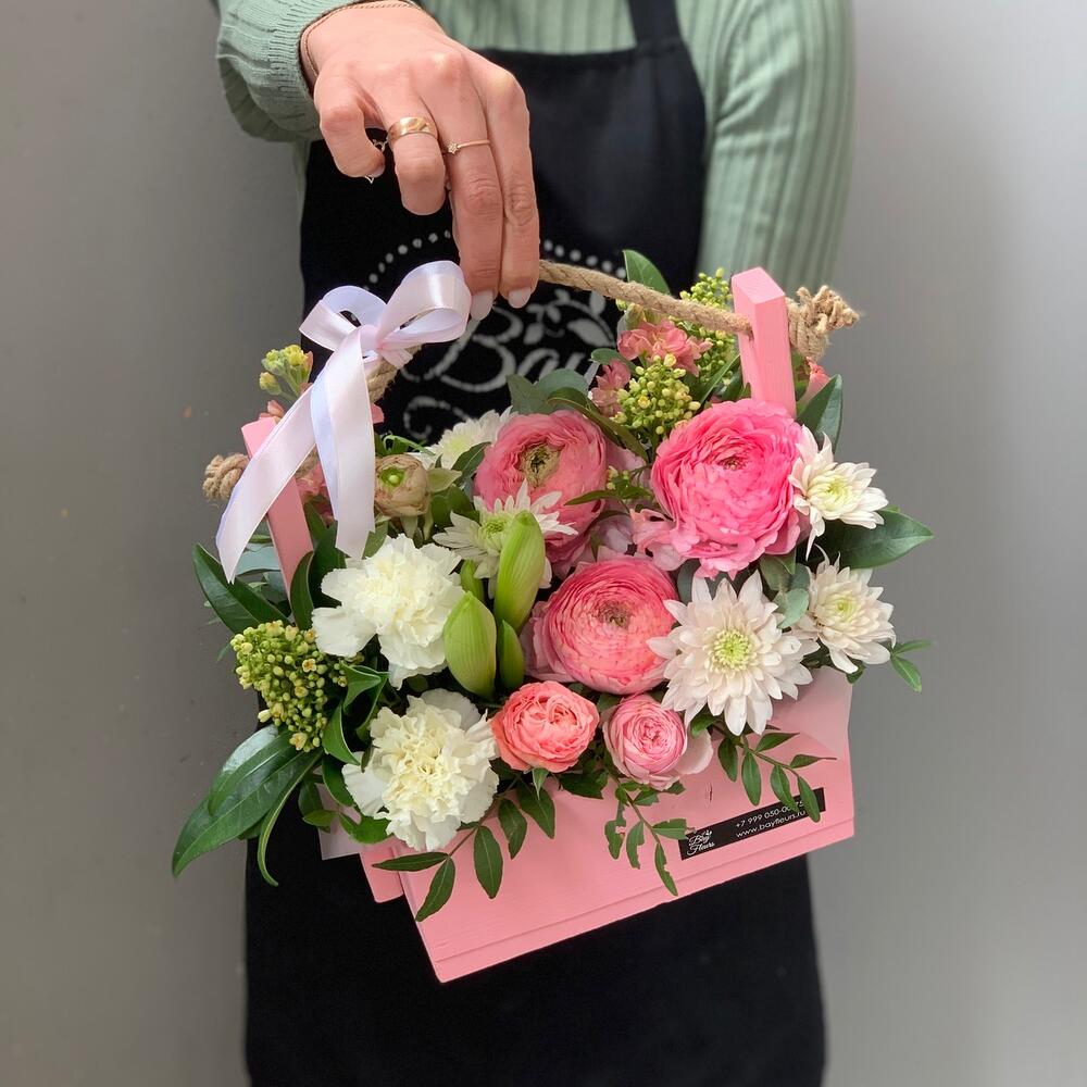 Ящик деревянный – 1 шт.Оазис флористический – 1 шт.Ранункулюс – 3 шт.Хризантема кустовая – 1 шт.Гвоздика – 2 шт.Скиммия – 1 шт.Маттиола белая – 1 шт.Кустовая роза розовая – 1 шт.Лента атласная – 2 шт.зелень декоративная – 2 шт.